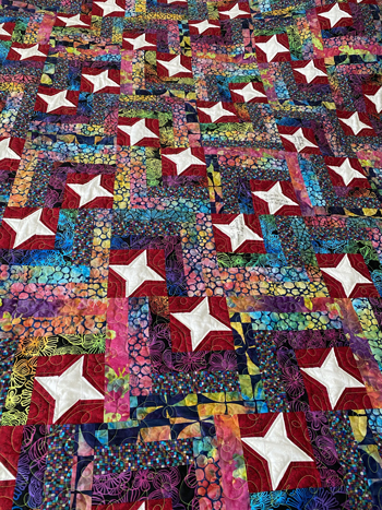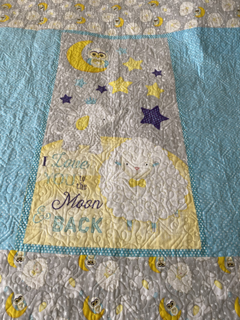This baby quilt is titled, The Newest Star in the Family Constellation. Before sending it to the new parents, I inked their names and their new born son’s name and their birthdates on a few of the white stars located in the center of the quilt. There are a lot of blank white stars left, for the parents to add future children and other family members’ names and birthdates: their siblings, parents, grandparents, aunts, uncles, cousins. The back of the quilt is a soft baby flannel panel that says, “I love you to the moon and back.